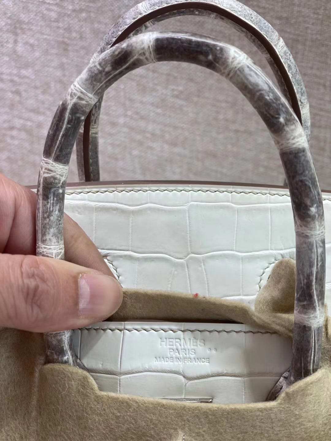 Each Himalaya Birkin is hand-crafted by a single Hermès artisan in Paris, requiring up to 48 hours of meticulous work. The niloticus crocodile skin is sourced from ethically managed farms in the Nile Valley, then subjected to a painstaking gradient dyeing process that fades from warm beige at the base to an ethereal white at the top — evoking the eternal snows of the Himalayas.